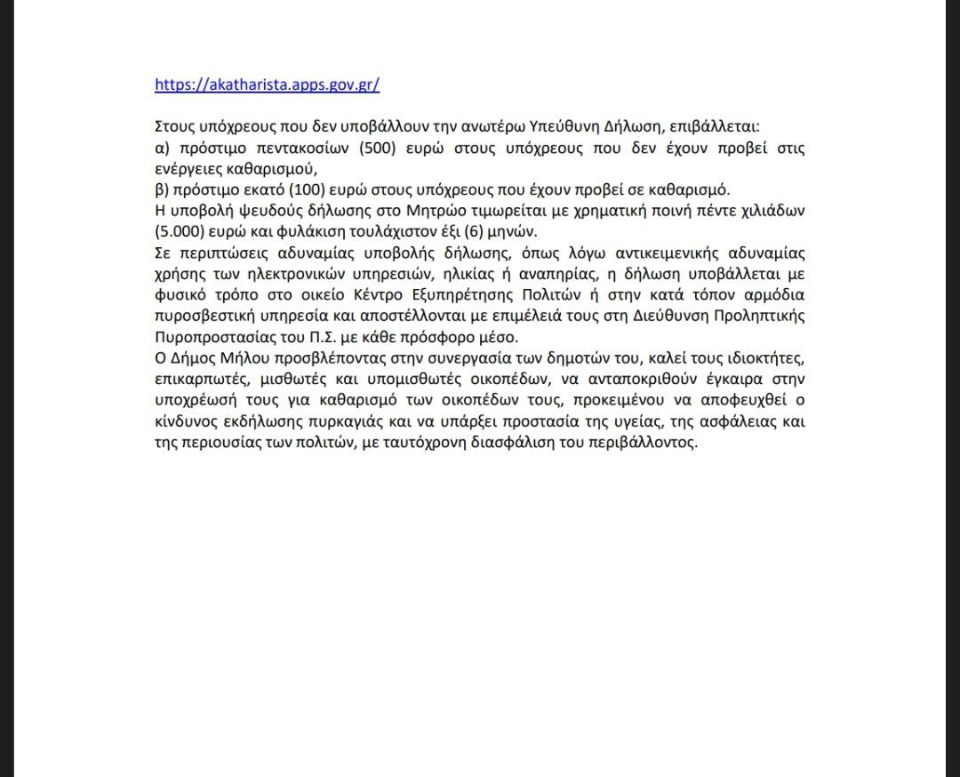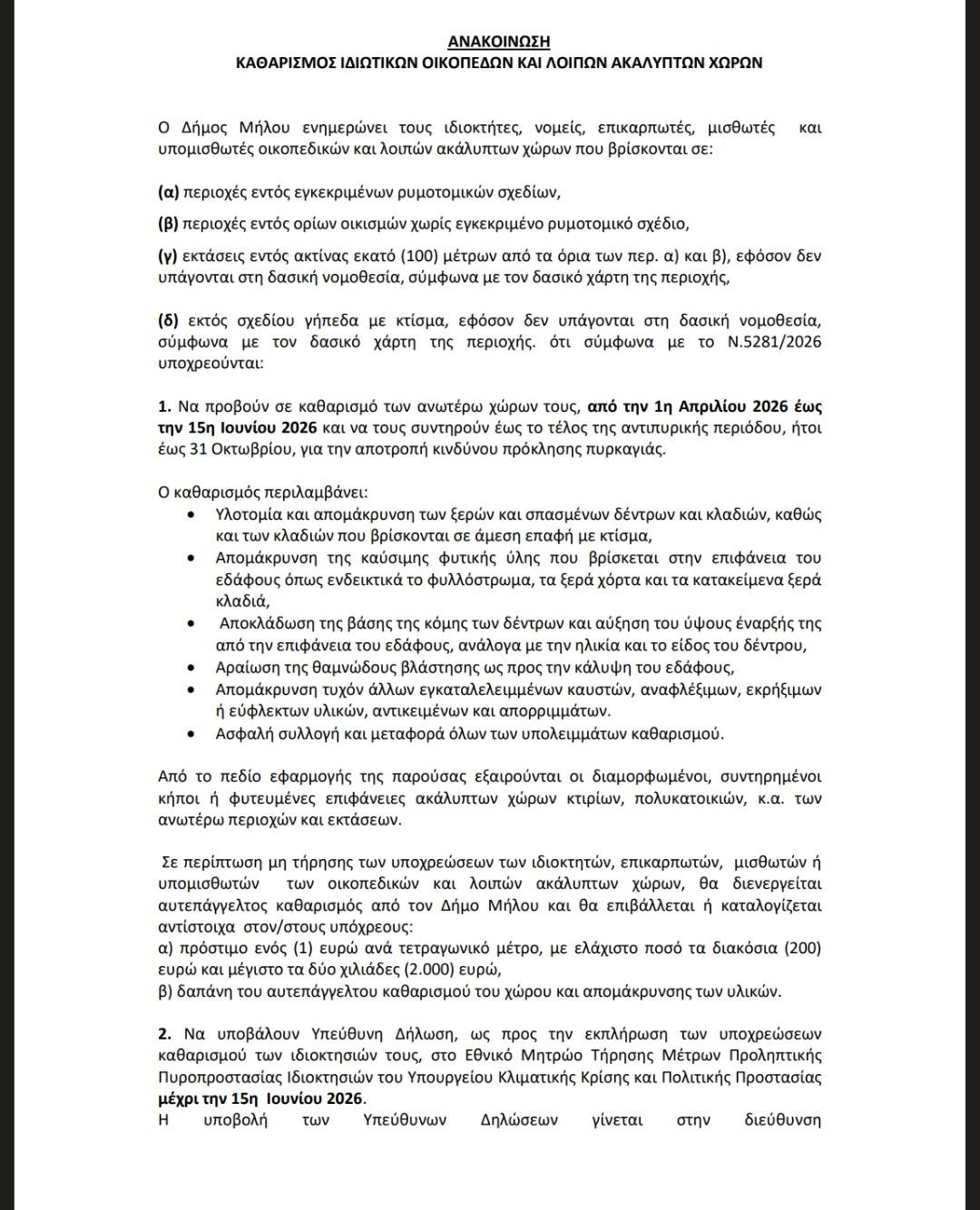 Δήμος Μήλου υπενθυμίζει την υποχρέωση καθαρισμού ιδιωτικών οικοπέδων και ακάλυπτων χώρων ενόψει της αντιπυρικής περιόδου, σύμφωνα με την ισχύουσα νομοθεσία