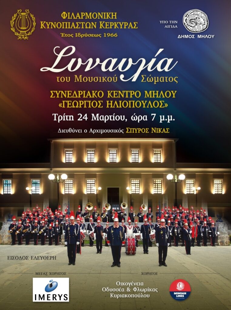 Ο Δήμος Μήλου, στο πλαίσιο των εκδηλώσεων εορτασμού της εθνικής επετείου της 25ης Μαρτίου 1821, έχει την ιδιαίτερη χαρά και τιμή να υποδέχεται για δεύτερη φορά στη Μήλο τη Φιλαρμονική Κυνοπιαστών Κέρκυρας, ένα ιστορικό μουσικό σύνολο με ξεχωριστή πολιτιστική διαδρομή και σημαντική προσφορά στον τόπο του.